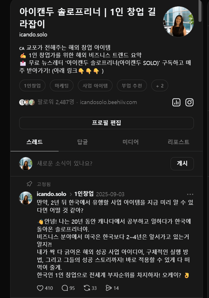 👉 스레드 먼저 보면 1인창업 트렌드를 절대 놓치지 않음