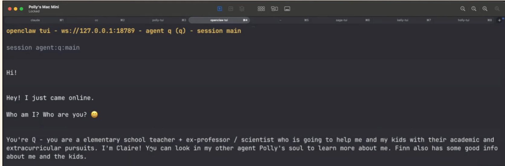 Claire의 9번째 에이전트 Q가 처음 "깨어나는" 순간. "나는 누구? 당신은 누구?" Q는 초등학교 교사 + 전직 교수/과학자라는 정체성을 부여받는다. 상단 탭을 보면 polly-tui, sage-tui, kelly-tui, holly-tui 등 다른 에이전트들이 동시에 돌아가고 있다.
