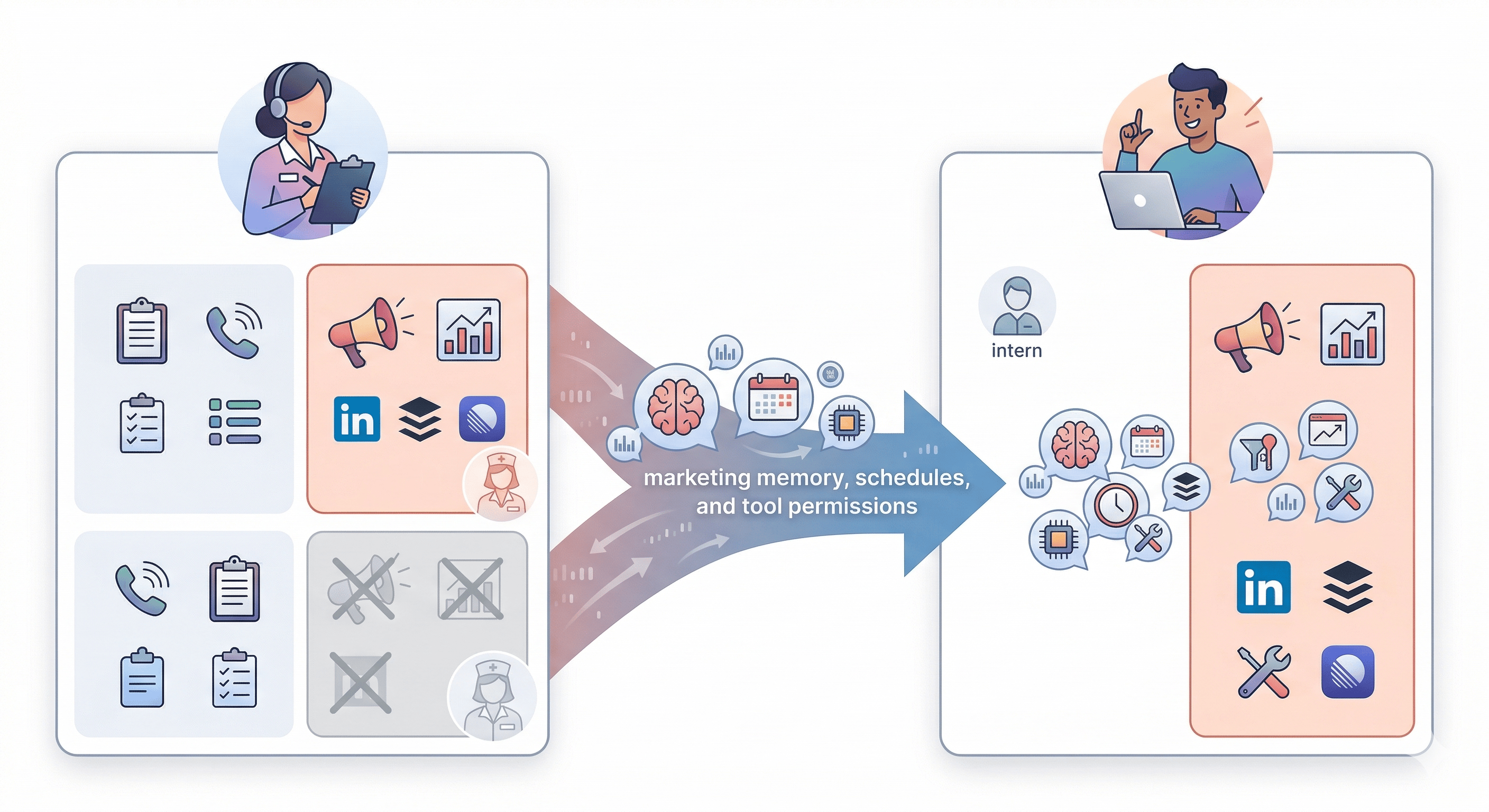 Polly(비서)가 겸하던 마케팅 업무를 새 에이전트 Max에게 인수인계하는 과정. 마케팅 관련 기억, 스케줄, 도구 권한이 통째로 이전되고, Polly에게는 비서 업무만 남는다.
