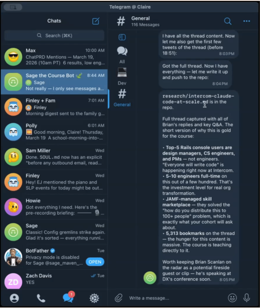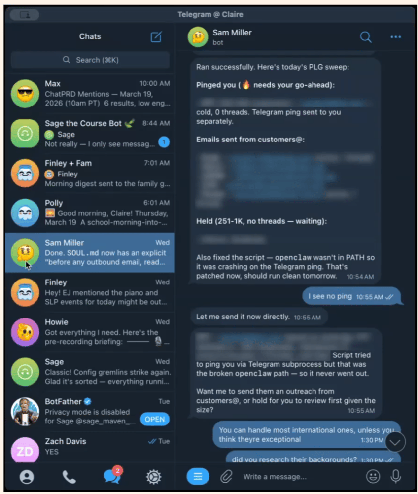Claire의 텔레그램 실제 화면. 왼쪽에 Max(마케터), Sage(강의 운영), Finley(가족 매니저), Polly(비서), Sam Miller(영업), Howie(팟캐스트 PD)가 동시에 대화 중이다. 오른쪽에서는 Sam이 아침 PLG 리드 분석 결과를 보고하고 있다. 9명의 AI 팀이 실제로 돌아가는 모습.