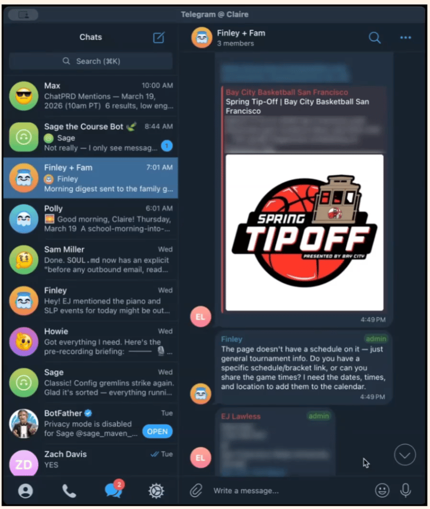 가족 매니저 에이전트 Finley + Fam 그룹 채팅. 3명(Claire, 남편, Finley)이 함께 있다. 아이의 농구 대회 "Spring Tip-Off" 일정을 공유받고, Finley가 "스케줄이 없으니 날짜와 시간을 알려달라"고 능동적으로 요청하는 모습. AI가 가족 그룹 채팅에서 일정 조율을 하는 실제 장면.