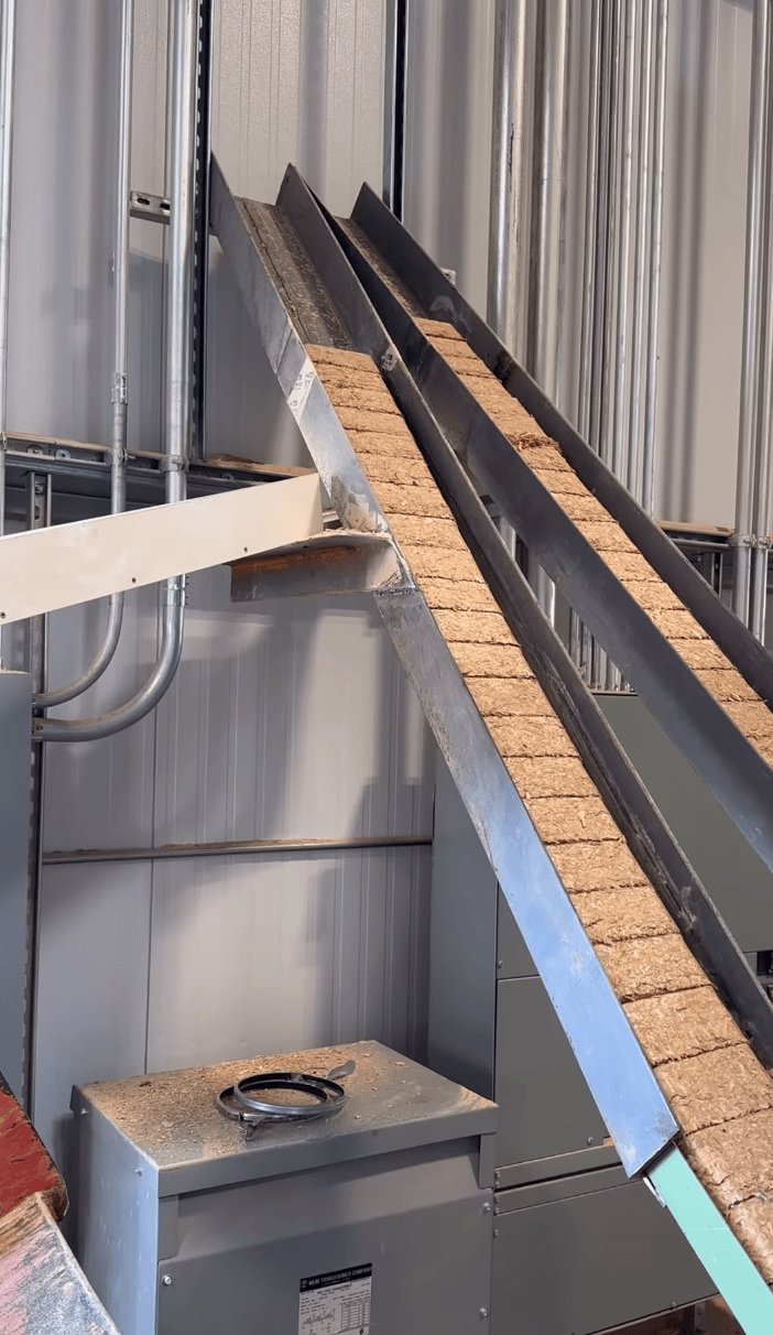 3️⃣ 잘게 갈린 나무와 톱밥을 브리켓 프레스에 넣고 압축한다.