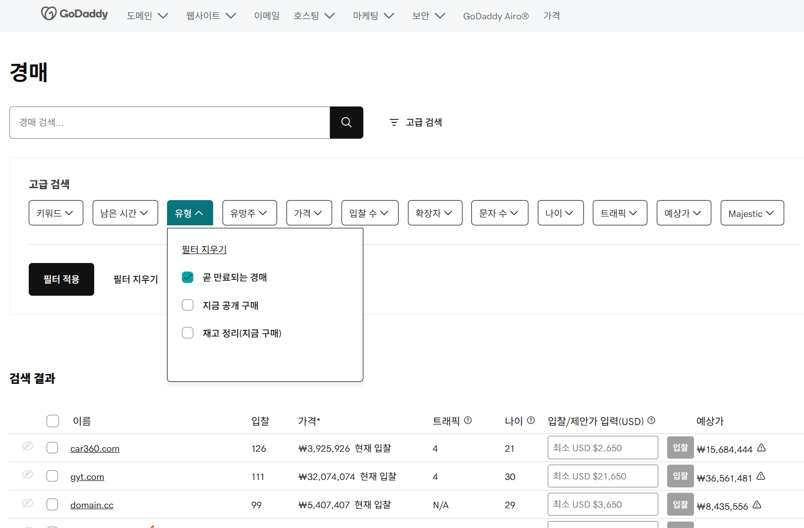 GoDaddy 경매> ‘유형’ 선택 > ‘곧 만료되는 경매’ 선택